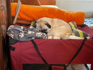 Ihres Zeichens Möpsiline und im November 2021 geboren. Gina ist geimpft, gechipt und kastriert. Und genau wegen dieser Kastranarbe mussten wir in eine Klinik, weil da ein Knubbel tastbar war.