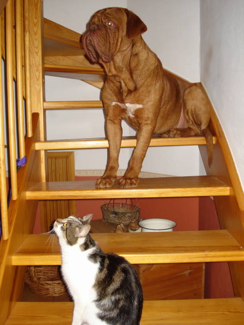Buddy verträgt sich jetzt auch mit der Katze bzw. die Katze hat sich an ihn gewöhnt. Er geht nicht mehr so stürmisch auf die Katze zu, er darf sie beschnuppern und es gab auch schon den Moment, dass sich beide Schnauze an Schnauze begrüßt haben.