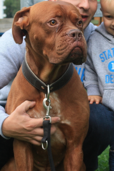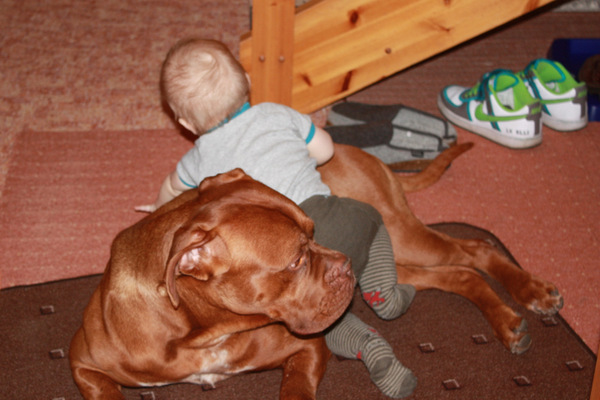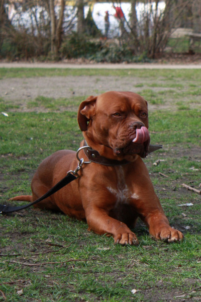 An der Leine läuft er problemlos auch an Rüden vorbei. Pascha’s Grundgehorsam ist bordeauxdoggentypisch seeeeeeeeeeehr gelassen *pfeif*. Mit Katzen liegen keine Erfahrungen vor.